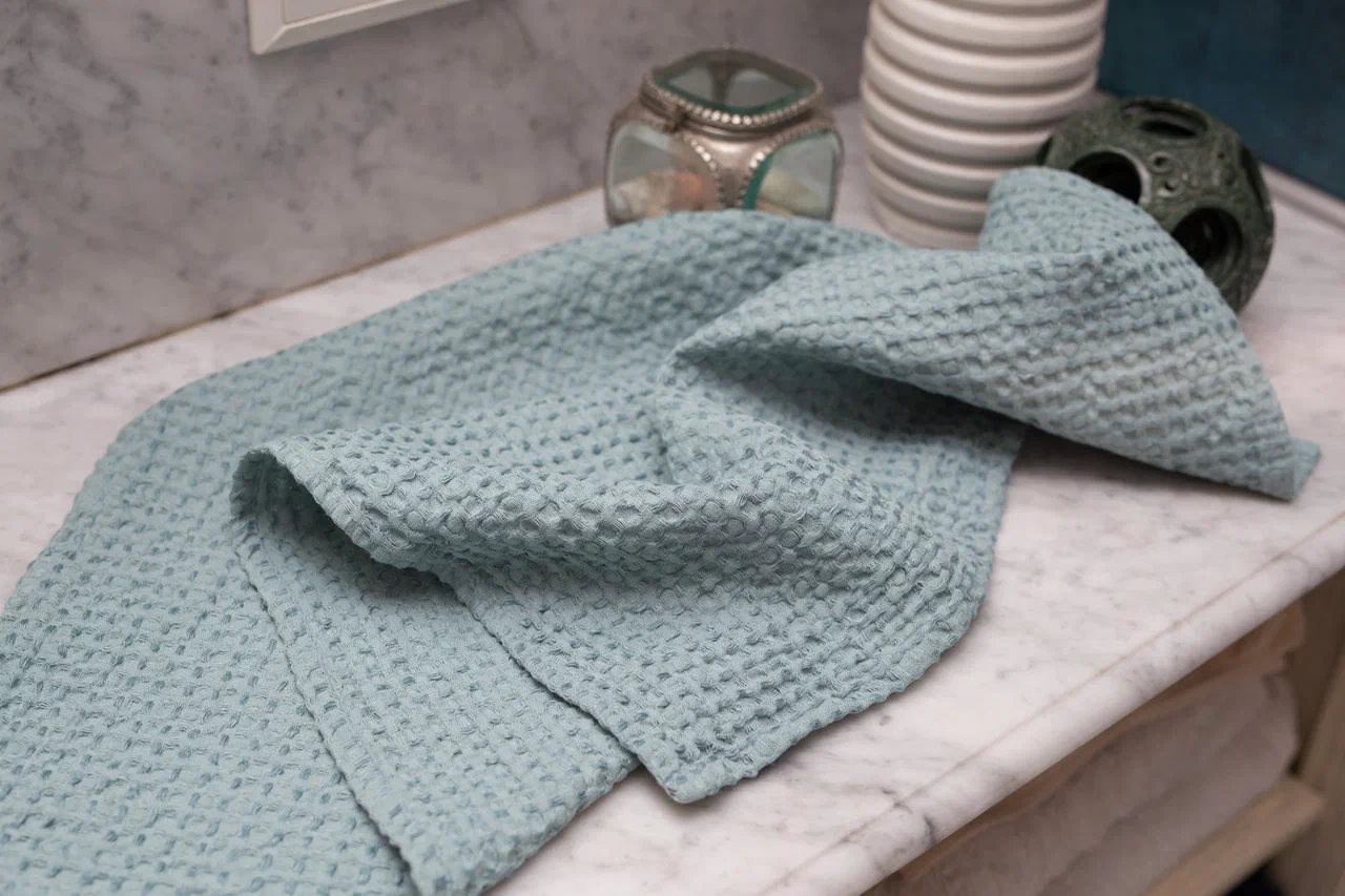 Свежий бирюзовый оттенок напоминает цвет чистой воды и придаёт полотенцу выразительный характер. Такой цвет оживляет пространство и становится яркой, но гармоничной деталью интерьера ванной комнаты.