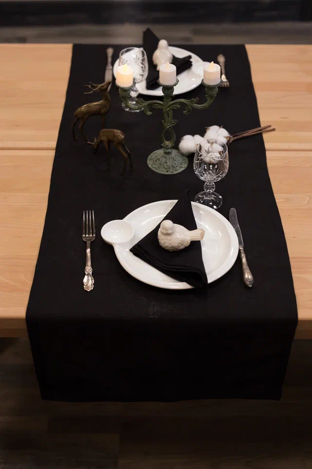 Глубокий чёрный оттенок подчёркивает форму посуды и создаёт красивый контраст в интерьере. Такой текстиль особенно эффектно смотрится на светлых и деревянных столах, собирая композицию сервировки и делая её более выразительной.