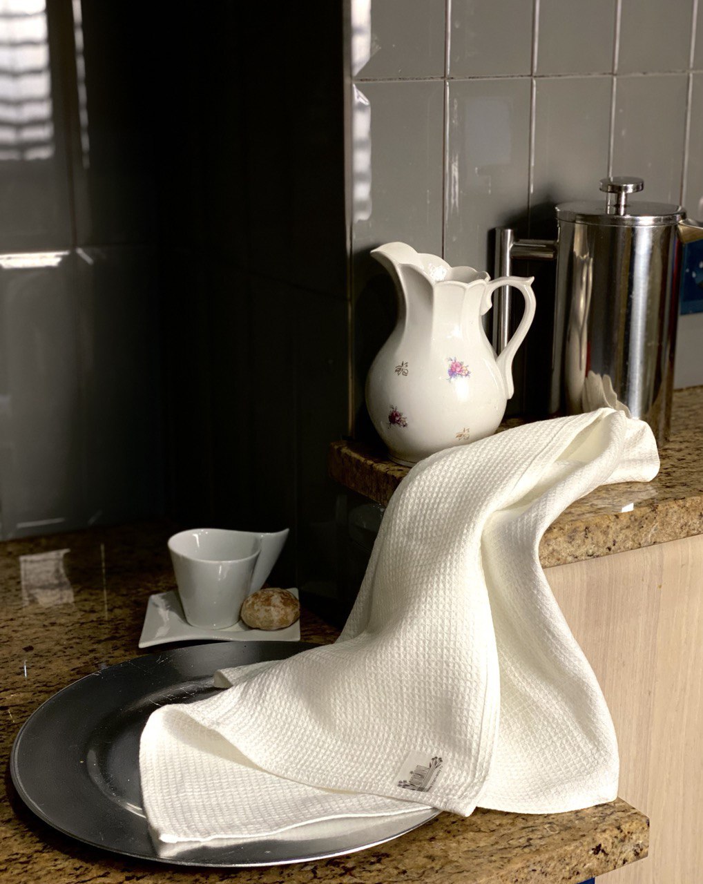 Белый цвет кухонного текстиля всегда выглядит особенно свежо. Такие полотенца легко вписываются в любой интерьер — от современной кухни до классического домашнего пространства. Они красиво сочетаются с белой посудой, деревянными поверхностями и натуральными материалами.